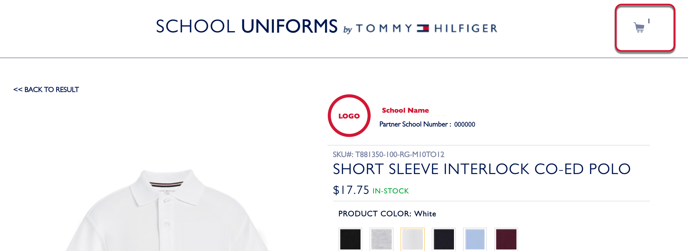 When an item is selected, the product page for that item will appear. On these product pages, you will find product details, full color images, and links to our size charts. You will then select your size range, size, color, and quantity. The logo details are predefined by the school administrator. If the logo is required, you will not be able to add the item to your shopping cart without it. If the logo is optional, you will be given the choice to apply it or not. If the logo is not allowed, no logo option will appear. Click ‘Add to Cart’ and the item(s) will be added to your cart. You will be prompted to either continue shopping or checkout.